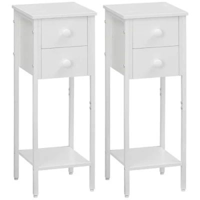 2 Drawers, More Storage Space: This tall bedside table features a double drawer design, providing you with more storage space, allowing you to easily organize and store various small items, keeping your space tidy and orderly Quality Materials: This slim telephone table is made of premium particleboard and metal, ensuring good stability and durability. The top can bear up to 31.8 kg and the bottom shelf 25 kg, making it suitable for daily use or office occasions Versatile for Various Scenarios: Whether as a side table, bedside table or telephone table, this slim sofa side table can perfectly adapt to various roles and easily handle different occasions. Its versatility makes it an indispensable part of your home life Exquisite Color Matching: We focus on details. This narrow side table is in pure white, complementing other furniture perfectly. Whether your home style is modern, minimalist, or classic, it can add a touch of elegance to your space Adjustable Feet for Stability: Uneven floors are no longer a problem. We thoughtfully equipped this bedside table set of 2 with adjustable feet to ensure stability on any surfaces, enabling you to enjoy convenience wherever you are