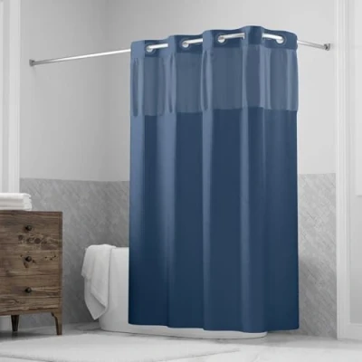Hookless It’s A Snap! Waffle Shower Curtain, 3 in 1 Curtain Includes Fabric with Sheer Top Window, Flex On Rings & Liner Magnets, 71 x 74, Navy