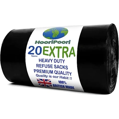 🌎HooriPoori Heavy Duty Bin Bags: British Made 20 extra large black heavy duty bin bags on a roll. Ideal for every day use for collecting waste of home, office, shops, church, schools, nursery, caterers, trade and builders. 📏Size & Dimensions: 725 x 990 mm Capacity, It can be used to collect 50l, 60l, 70l, 80l, 90l & up to 100 Litre and have the capability of lifting up to 20 Kg of waste without tearing and leakages. Thickness: 200 Gauge -- 50 micron 🏴British Made: From 100% high tech recycled tear resistance and low density polyethylene material, helping to reduce carbon footprint, and making UK greener. Our products are manufactured in the United Kingdom. 🤝 Dedication: Our mission revolves around providing eco-conscious packaging solutions to lessen our environmental footprint and contribute to a greener planet. Our customers are paramount to us, and if you are unsatisfied with our product, we encourage you to utilize Amazon's product return policy.