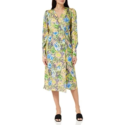 Hope & Ivy Womens The Katie Wrap Front Midi with Blouson Sleeve and Tie Waist Special Occasion Dress, Yellow. Green, 10 UK