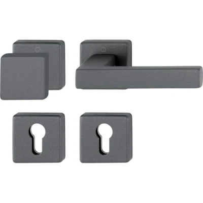 Fire-retardant replacement fitting: tested fire protection according to ÖNORM B3859, ideal for safe and durable door solutions in the property and private sector Modern design: elegant rosette with 52 x 52 mm made of aluminium in sand black - ideal for upgrading your living room or office High functionality: equipped with return spring, maintenance-free plain bearing and quick pin 8.5 mm for comfortable and long-lasting use Specifications: Class according to EN 1906: 3 | Fire protection test: ÖNORM B3859 | Rosette: 52 x 52 x 10 mm | Door thickness: 40 - 45 mm | Hole: PZ Box contents: 1x HOPPE Austin fire retardant replacement set, aluminium sand black, Manufacturer: HOPPE