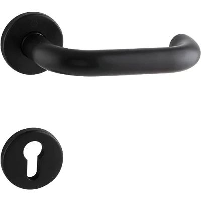Modern handle set made from robust and durable stainless steel with a black matte finish With innovative quick-pin technology for quick and screw-free installation of the door handles The return spring prevents wear out even after years of use - after pressing the door handle, it returns to the starting position Rosette BB: diameter 52 x 8 mm, square quick pin: 8 mm fixed with A-sleeve to 8.5 mm Box contents: 2x door handle on rosette, 2x rosette BB, 1x quick pin, mounting accessories for rosettes: self-tapping threaded screws, stainless steel black matt, Manufacturer: HOPPE