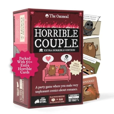How To Play: You'll compete to create a love story fit for a classic dark comedy. In the Extra Horrible Edition, you’ll have more material than ever to create distasteful comics starting with a Question card, then a Response card, and topped off with a ludicrous Compromise card. Play as a couple or with friends, cooperatively or competitively. Nothing says date night like a little chaos! What's Included: An Extra Horrible 57 Question cards, 166 Response cards, and 215 Compromise cards. No Couple? No Problem: You can play with just two or add up to eight degenerates who don’t mind laughing at love gone wrong. Be Horrible Anywhere: Take Horrible Couple Extra Horrible Edition anywhere you have space to spice up the romance with a comic about sexy handcuffs. From intimate date nights to full on game night , it’s always ready to stir up fun. From the folks that brought you Exploding Kittens: Exploding Kittens believes in making games that make your friends and family more entertaining! This is a funny, dark humor card game that's only for players aged 17+. We always make sure to keep the craziest content with the ones who can handle it!, Manufacturer: Exploding Kittens