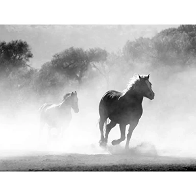 Horses Running Mist BW Large Canvas Wall Art Print