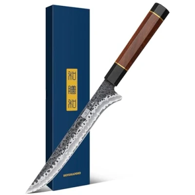 【Outstanding Performance】This flexible boning knife has a flat cutting edge with a slight curve up to its sharp point, which is designed to easily separate the meat, chicken and fish from the bone. Whether you're filleting fish or working with other delicate ingredients, this knife provides precise and clean cuts 【Premium Super Steel】HOSHANHO fillet knife is crafted with superb quality using high-quality 9-layer composite steel. This type of steel offers exceptional performance and durability, making it an excellent choice for a fillet knife. The steel's hardness, rated at HRC 60, ensures wear-resistance, making the blade suitable for heavy and repetitive use 【Comfortable Ergonomic Handle】Ergonomically handle is made of G10 and rosewood, providing balanced grip, enhanced control, and comfort. The handle is carefully balanced with the thin blade, allowing for effortless movement and reducing strain on your palm and wrist 【Razor Sharp 12° Edge】The heart of the fish knife is its 10Cr15CoMoV steel core, renowned for its outstanding hardness and ability to retain an incredibly sharp edge. Hand-honed to a precise 12-degree angle, the blade delivers effortless precision and clean cuts, making it the perfect tool for deboning, trimming, and filleting with ease 【Flexible & Precision Cutting】The fillet knife features a curved design for optimal flexibility, allowing the knife to easily follow the natural contours of the fish. Its fine, flexible blade provides excellent control, making it a versatile tool for both professional chefs and home cooks