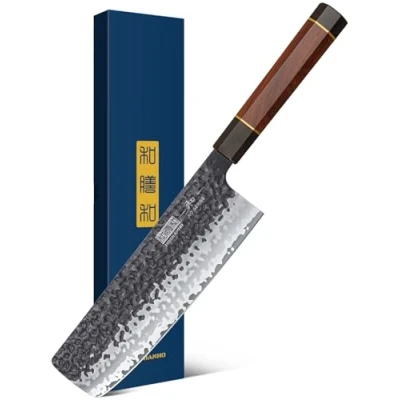 【Advantageous Straight Edge】Nakiri knife perfectly blends the versatility of a chef's knife with the blunt shape of a cleaver; The square shape and straight edge make it ideal for chopping cumbersome vegetables (such as sweet potatoes, pumpkin or zucchini) when the rocking motion of a chef knife won't do 【High Quality Carbon Steel】Using the traditional Japanese Honbazuke honing method, the blade comprises 9 layers of composite steel with a premium 10Cr15CoMoV core, which hardness up to 60±2, expertly cryogenically treated to enhance its performance and longevity 【Rosewood Handle】Ergonomic rosewood handle allows for optimal hand control and comfort, along with balanced weight distribution for demanding professional settings; Its exceptional resistance to cold, heat, corrosion, and humidity guarantees long-lasting durability 【Ultra Sharp Kitchen Chopping Knife】The 2.5 mm thick double-bevel blade is sharpened to create a 12-15° angle on both sides, providing extreme sharpness; It's deep, flat blade is perfect for fast and fluid chopping, as well as even-sized slices of lettuces, cabbages, and other leafy greens 【Elegant Design】Blade: Stonewashed Finish & Black Oxide Procedure; The hammered texture eliminates friction and prevents food from sticking to the blade; Traditional Japanese octagonal handle is equipped with two copper wires, which is low-key and luxurious