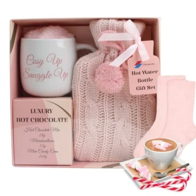A COSY HOT CHOCOLATE AND HOT WATER BOTTLE GIFT SET: A unique way of reaching out to your loved ones this season. Send a hug in a mug for your loved ones to have a cosy night in with our hot water bottle and hot chocolate mug gift set. Enjoy a cosy up and snuggle up mug hot chocolate powder mini marshmallows and mini candy cane HOT WATER BOTTLE GIFT SET WITH COSY MUG HOT CHOCOLATE MARSHMALLOW TOPPERS AND CANDY CANE: Unique and luxury christmas gift idea for your loved ones this christmas. Perfect for mothers day anniversary, valentines day, birthday. Enjoy a nice cocoa on a cold winter night with our luxury hot chocolate and hot water bottle gifts set filled with hot chocolate selection of hot chocolate sachets mini marshmallows and candy cane stirrers. RICH AND CREAMY: Enjoy a rich and creamy luxury hot chocolate gift for women or add this to you christmas hot chocolate hamper for loved one. whats a mug and sock set when you can send a loved one a mug and hot water bottle in a cosy knitted cover. Ho chocolate gift filled with the perfect hot chocolate gift set selection. HOT CHOCOLATE GIFT SET WITH MUG: hot chocolate selection gift set to make the perfect hot chocolate drink and a unique hot chocolate gifts. hot chocolate mugs with hot chocolate mix for the perfect hot chocolate gift sets for a nice and cosy gift this christmas with mini candy cane stirrers for the hot chocolate stirrers. COSY CHRISTMAS: enjoy a cosy christmas with your loved ones with our hot water bottles gift set with hot chocolate mug set for xmas hot chocolate with hot chocolate marshmallow for hot chocolate toppers and candy cane. cosy hot chocolate gift set Hot water bottle with cover uk for women, adults, girls. Unique christmas pamper gifts for mum