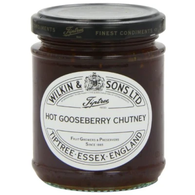 A spicy yet subtle gooseberry chutney with added red currants. Superb with cheese and surprisingly good with oily fish. The Wilkin family have been farming at Tiptree, Essex, since 1757, and making quality preserves there since 1885. We grow a wide range of traditional English fruits and use them to make conserves and condiments in our nut-free factory by the farm. Our products are made to cherished recipes and are free from artificial colours and flavours. We inspect and prepare our fruit by hand then cook in small batches using traditional, copper-bottomed pans.