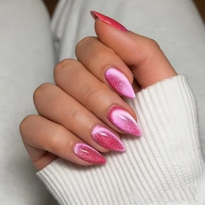 Hot Pink Cat Eye False Nails Short Almond, SXVME 30 Pcs Glitter Press on Sparkly Shiny Fake Cute Bling Glue Medium Stick for Women Daily Wear