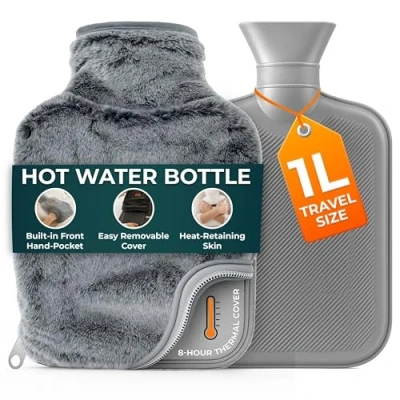 Hot Water Bottle 1L Grey for Pain Relief, Hand and Foot Warmer Luxury, Soft Washable Bag Cold Compress