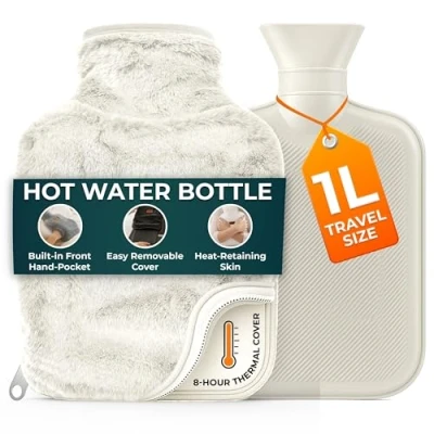 Hot Water Bottle 1L White for Pain Relief, Hand and Foot Warmer Luxury, Soft Washable Bag Cold Compress