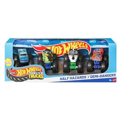 Hot Wheels Monster Trucks, 1:64 Scale Trucks Toy Set of 4, Giant Wheels, Favorite Characters and Cool Designs, JJT67