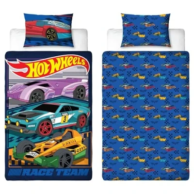 OFFICIAL PRODUCT: Officially licensed by Hot Wheels, this bedding set includes a duvet cover and pillowcase. On the front side there’s a large print of race cars and the Hot Wheels logo on a blue background REVERSIBLE: On the reverse side there’s a repeating pattern of race cars, checkerboards and the Hot Wheels logo, on a dark blue background, that runs on to the pillowcase EASY CARE: The duvet cover is closed with poppers, so it’s easy to open and remove ready for the wash! The bedding is washing machine and tumble dryer safe at a low temperature RESPONSIBLY SOURCED: Made from recycled materials and a polycotton mix (52% cotton 48% polyester), so this bedding set is kinder to the environment MEASUREMENTS: Standard UK single bedding size, the Hot Wheels duvet cover measures 135 x 200cm, and the pillowcase measures 74 x 48cm
