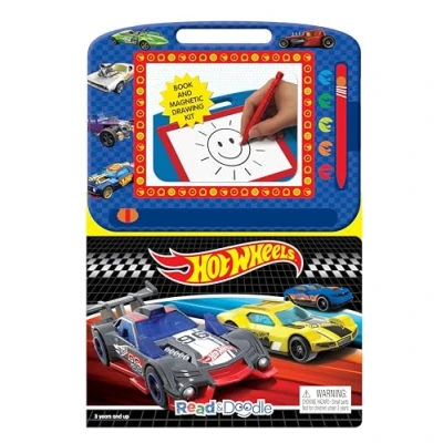 Hot Wheels Read & Doodle Learning resources for kids, a magnetic drawing pad, an easy to use pen, 22 page board book reading and