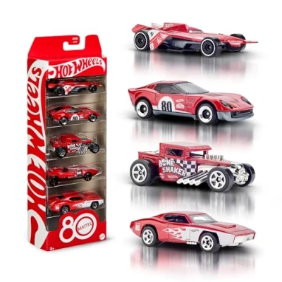 Hot Wheels Toy Cars, 5 Pack of 1:64 Scale Cars with Collectible Deco & Packaging, Core Mattel 80th Anniversary Set Vehicles, JGK08