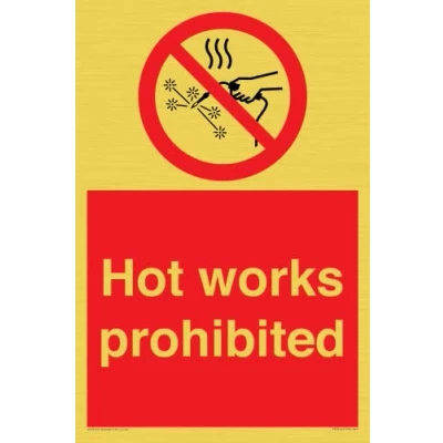 P039 : Hot works prohibited This sign is made from vinyl gold sticker Gold metal effect sticker for flat, clean surfaces. Not for rough, plastic, or dusty surfaces. A4 portrait Sign Text: Hot works prohibited