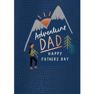 FATHER'S DAY CARD FOR A BRILLIANT DAD - let an adventurous Dad know how much he's loved on Father's Day with this stylish card from Hotchpotch Designs ORIGINAL HOTCHPOTCH ARTWORK - the contemporary illustration shows a happy man with walking sticks about to hike up a mountain range, with a gold morning sun, fir trees and a gold and navy blue polka dot background AFFECTIONATE MESSAGE - The words on the front of the card read 'Adventure Dad' written over the mountain range, with the words 'Happy Father's Day' written underneath. The inside of the card is blank for you to write a message of appreciation and love. PREMIUM QUALITY CARD - made from highest quality, recyclable materials that Dad will be delighted to receive as you show appreciation for his adventurous spirit this Father's Day GENUINE HOTCHPOTCH GREETINGS CARD - Hotchpotch London create award-winning collections of luxury cards proudly made in the UK since 1995