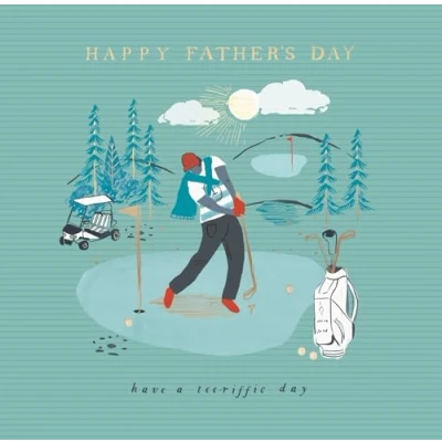 HUMOROUS FATHER'S DAY CARD FOR A DAD - make your golfer dad smile with this stylish, illustrated card featuring a clever golf pun wishing him a 'tee-riffic day' ORIGINAL HOTCHPOTCH ARTWORK - the contemporary design features a detailed illustration of a man playing golf in the sun surrounded by fir trees, a golf cart and golf bag on a grass-green background GOLF-THEMED DESIGN - The words on the front of the card read 'Happy Father's Day' above the illustration, and 'have a tee-riffic day' written underneath. The inside of the card is blank for you to write your own message of love and appreciation. PREMIUM QUALITY CARD - made from highest quality, recyclable materials that will make Dad laugh as you recognise his sporting prowess this Father's Day GENUINE HOTCHPOTCH GREETINGS CARD - Hotchpotch London create award-winning collections of luxury cards proudly made in the UK since 1995