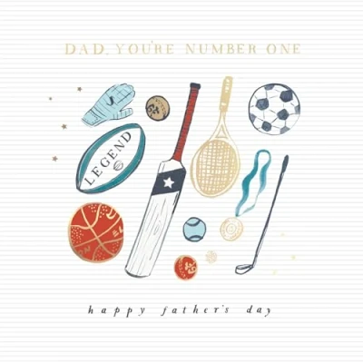 FUN FATHER'S DAY CARD FOR A DAD - make your sport-mad dad smile with this stylishly illustrated card that recognises his love as sport as well as his brilliance at being a dad! ORIGINAL HOTCHPOTCH DESIGN - the contemporary design features sketches of a cricket bat and ball, a goalkeeping glove, a tennis racket and ball, a golf club, a football, basketball, rugby ball and pool ball as well as a gold medal on a white striped background with gold stars. AFFECTIONATE MESSAGE - The words on the front of the card read 'Dad, you're number one' above the illustration, with 'Happy Father's Day written underneath. The inside of the card is blank for you to write your own message to tell Dad how much he means to you. PREMIUM QUALITY CARD - made from highest quality, recyclable materials that will make Dad smile as you show appreciation his sporting and parenting skills this Father's Day GENUINE HOTCHPOTCH GREETINGS CARD - Hotchpotch London create award-winning collections of luxury cards proudly made in the UK since 1995