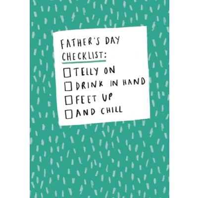 HUMOROUS FATHER'S DAY CARD FOR DAD - Let your do-it-all Dad rest this Father's Day with this vibrant card that mimics a checklist of tasks with a funny twist ORIGINAL HOTCHPOTCH DESIGN - the fun, sketched design on a green doodled background features a white checklist of tasks instructing Dad to put the telly on, get a drink, put his feet up and chill this Father's Day. FUNNY MESSAGE- The words on the front of the card read 'Father's Day Checklist: telly on, drink in hand, feet up and chill'. The inside of the card is left blank for you to write your own loving message. PREMIUM QUALITY 5 x 7 INCHES CARD - made from highest quality, recyclable materials, this funny card will help Dad take a much needed break on Father's Day this year GENUINE HOTCHPOTCH GREETINGS CARD - Hotchpotch London create award-winning collections of luxury cards proudly made in the UK since 1995