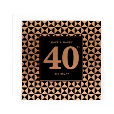 LUXURY 40th BIRTHDAY CARD - printed on top quality board with generous copper and gold foiling, this card is inspired by the sophisticated designs of London's Savile Row tailors CLASSIC WITH CONTEMPORARY TWIST - bold patterns and 1930s-style typography combine to create a stunning card that's perfect for a friend or family member celebrating his milestone 40th birthday! BLANK INSIDE - the words on the front cover read 'Have a Happy 40th Birthday'; the card is blank inside for your own message CARD MEASURES 6 x 6 INCHES - made from highest quality materials, with envelope included, this upmarket card from the Hotchpotch Pocket Square range is also fully recyclable GENUINE HOTCHPOTCH GREETINGS CARD - Hotchpotch London create award-winning collections of luxury cards proudly made in the UK since 1995