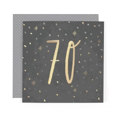 STUNNING 70TH BIRTHDAY CARD FOR FRIENDS OR FAMILY - say a heartfelt congrats with this vibrant card featuring chic gold foil numbering and an eye-catching design; it's perfect for anyone celebrating their milestone 70th birthday STRIKING CONTEMPORARY DESIGN - the artwork shows a gold foil number 70 on a charcoal background with gold foil hearts and stars motif; the card is blank inside so there's plenty of room to write personal birthday wishes! BESPOKE DOTTY ENVELOPE - this lovely card is printed on premium board and comes with a cute dotty envelope for convenient postage within the UK or abroad CARD MEASURES 6 x 6 INCHES (15 x 15 CMS) - made from recyclable FSC-certified board, with envelope included, this premium card from the Hotchpotch Anise range is sure to spread a little happiness! GENUINE HOTCHPOTCH GREETINGS CARD - Hotchpotch London create award-winning collections of luxury cards proudly made in the UK since 1995