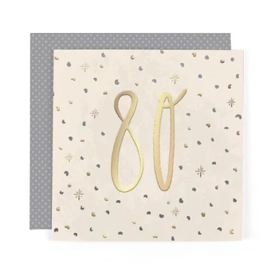 STUNNING 80TH BIRTHDAY CARD FOR FRIENDS OR FAMILY - say a heartfelt congrats with this vibrant card featuring chic gold foil numbering and an eye-catching design; it's perfect for anyone celebrating their milestone 80th birthday STRIKING CONTEMPORARY DESIGN - the artwork shows a gold foil number 80 on a cream-coloured background with gold foil hearts and stars motif; the card is blank inside so there's plenty of room to write personal birthday wishes! BESPOKE DOTTY ENVELOPE - this lovely card is printed on premium board and comes with a cute dotty envelope for convenient postage within the UK or abroad CARD MEASURES 6 x 6 INCHES (15 x 15 CMS) - made from recyclable FSC-certified board, with envelope included, this premium card from the Hotchpotch Anise range is sure to spread a little happiness! GENUINE HOTCHPOTCH GREETINGS CARD - Hotchpotch London create award-winning collections of luxury cards proudly made in the UK since 1995