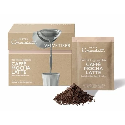 10 Caffè Mocha Latte hot chocolate sachets Designed to work in harmony with the Velvetiser Compatible with all Velvetiser models Real chocolate flakes – milk and white chocolate Arabica coffee Hotel Chocolat’s mantra is: ‘more cacao, less sugar’ and their three pillars are authenticity, originality and ethics.