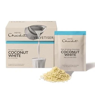 Creamy coconut, smooth caramel, melded into white drinking chocolate. Enough for 10 serves of drinking chocolate in the Velvetiser System Made according to Hotel Chocolat’s ‘more cacao, less sweet’ mantra. 100% of Hotel Chocolat’s cacao is Engaged Ethics. Hotel Chocolat’s three pillars are authenticity, originality and ethics.
