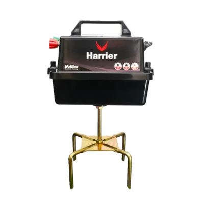 Hotline Harrier Battery-Powered Electric Fence Energiser The Hotline Harrier is a highly portable, battery-powered electric fence energiser designed for everyday farm use, strip grazing, and small paddock fencing, particularly for horses and light livestock. With high and low power settings, it delivers reliable performance while allowing you to conserve battery life once animals are accustomed to the fence. The Harrier is ideal for small paddocks or short enclosures, light livestock, strip grazing, rotational paddocks and temporary fencing setups where a compact, easy-to-move energiser is required. It is not suitable for net fencing, larger or heavier animals, or long/permanent fence lines, where a more powerful energiser would be necessary. When introducing animals to a new electric fence, the energiser should be set to ‘High’ for the first seven days to establish fence respect. After this period, switching to ‘Low’ helps extend battery life without compromising effectiveness. The Harrier operates from either a 6V internal battery (not included) or a 12V external battery (not included), offering excellent battery efficiency. It also features a rigid 4-prong stand, making it stable and easy to position wherever required. Key Features * Operates from 6V internal battery or 12V external battery * Stored energy: 0.13 J | Output energy: 0.84 J * Maximum fence distance: 1 km * High & low power settings * Rigid 4-prong stand for stability * On/off switch * Low battery indicator * Pulse indicator * Highly portable with excellent battery life * Supplied with all cables necessary for a standard installation What's included * Harrier fence energiser * Ground connection leads * Fence connection lead * 6v battery connection lead * 12v connection leads Energiser Performance Figures - Harrier HLB150 Input Consumption Stored Joules Output Joules Output Volts Output Under Heavy Load 6V DC 9V DC 12V DC Hi: 28mA Lo: 18mA 0.10 0.06 0.08 0.04 7800V 6200V 1600V 1500V Maximum Recommended Distance: 1km (single wire line), 0 sheep nets, 0 poultry nets Battery life (12V 75Ah battery): >12 weeks (Hi), >13 weeks (Lo) Battery life ( 9V 90Ah battery): >17 weeks (Hi), >24 weeks (Lo) Battery life ( 6V 40Ah battery): >8 weeks (Hi), >13 weeks (Lo)