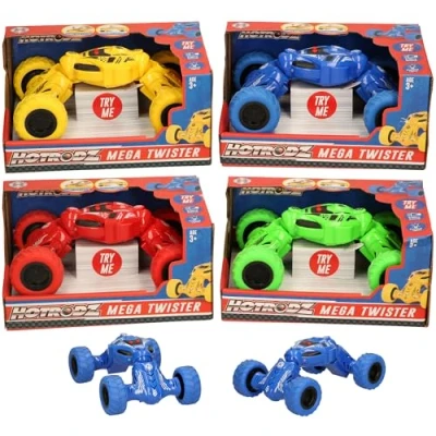 TRANSFORMING DESIGN: Unique twisting mechanism allows this toy vehicle to perform incredible stunts and manoeuvres with its flexible body structure COLOUR OPTIONS: Available in four vibrant colours - blue, yellow, red, and green, each featuring durable construction and oversized rugged wheels INTERACTIVE FEATURES: Equipped with a 'Try Me' demonstration feature, allowing testing of the toy's functions right in the packaging AGE APPROPRIATE: Specifically designed for children aged 3 years and above, providing safe and engaging play experiences STURDY CONSTRUCTION: Built with robust materials featuring large, grippy wheels and a flexible centre body for enhanced durability and play value, Manufacturer: Padgett Bros (AtoZ)