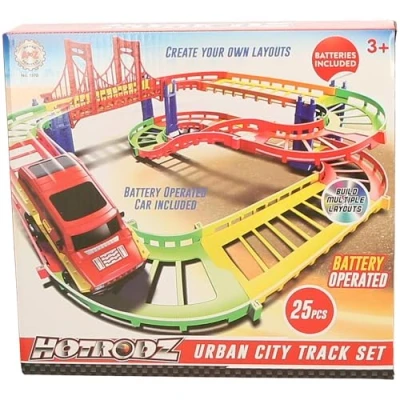 COMPLETE SET: 25-piece urban track set including colourful track segments, supports, and a battery-operated car for endless racing fun CUSTOMISABLE LAYOUTS: Multiple configuration options allow children to create their own unique track designs and racing experiences BATTERY POWERED: Set includes a motorised car and batteries, enabling immediate play right out of the box AGE APPROPRIATE: Specially designed for children aged 3 and above, offering safe and engaging play experience CREATIVE PLAY: Track pieces feature vibrant colours and include curved sections, straight paths, and elevated elements for exciting racing adventures, Manufacturer: Padgett Bros (A to Z)