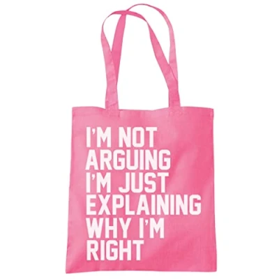Those of us with an argumentative personality will be able to relate to this slogan. Our I'm Not Arguing I'm Just Explaining Why I'm Right tote bag is perfect if you are MR Know It All or MRS Right all the time. This eco bag is great for that moody, argumentative teen in your life, or that grumpy old git - The ideal gift! TOTE BAG - Bag for life. Can be carried by hand or over the shoulder, Handle length 67cm PROFESSIONAL PRINTING: HotScamp shopper bags are designed and printed in the UK. We print our graphics with state of the art equipment to ensure vibrant colors and lasting durability. These bags are the perfect gift for any occasion. GREAT QUALITY: Our Tote Bags are manufactured to be high quality using 100% cotton SATISFACTION GUARANTEED: Whether you're sarcastic, nerdy, cute, adorable or sarcastic get ready to have fun with this graphic bag. Sponge clean only. If you are unsatisfied for any reason, we will provide an immediate exchange or refund upon return. AWESOME GIFTS: Cool shopper bags are great for your family and friends and make ideal Christmas, birthday, anniversary presents for your brother or sister or treating yourself to a great bag. They're great geek gifts ideas for a retro nerd with a sarcastic sense of humour. From gamer prints to 80s and 90s presents for sexy dadbods! RANGE OF GARMENTS Check our other Amazon pages for this design on a hoodie, Tshirt, slim-fit womens tee, vest or kids tshirt. Check out all of the HotScamp range for more quality designs.