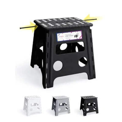 【Premium Quality & Non Slip】-Features a compact and sturdy seamless footrest,provide long-lasting strength and use.Improved product structure and Increase the folding seam position to prevent cracked ,making sure that the maximum load capacity of the folding step can be 300 pounds.Special rubber dots on the surface and anti-slip black rubber strap on each foot for maximum foot grip and gives amazing comfort, preventing slippage. 【Portable Folding Stool】-An extra light model is the Folding Step Stool Chair from Houseday. The clever puzzle-like design allows this particular compact stool to fold up into a low-profile package. Its wide base, non-slip feet and non-slip treads ensure it won't slip or slide when you stand on the stool. 【Space Saving Foldable Stool】-HOUSE DAY Stepping Stool save your closet space more than 90% when it folded up.It's quickly and easily folds away for convenient storage so you can opens with one flip of the hand.Also you can hides them in corner at home because it's so compact. 【Safe Upgrade Kids Stand Stool】-Features improved the folding bar,which can prevent from collapse inward while standing on it.HOUSE DAY have designed a safety stop gap feature that allows the foldable stool to prevent being squashed, great for kids & adults. Four round corner super safe protect your body from clashing. All of this design is put your kids safe first. 【Quality Gurantee】-Keep using quality materials to ensure the best quality. The lightweight plastic is hardy and not prone to rust or decay. It’s perfect for any gardener looking to hunker down with their plants or reach for that extra tall shelf in the garden shed. 【Safety Guidelines】-HOUSE DAY Folding Step Stool is EN 581 certified, we offer a wide range of height sizes (22/27/33/40/46cm) of step stools to choose from. If we need to stand on it to reach a high place, please make sure the stool is fully extended and on a smooth surface. Please note that children under the age of three should not use the stool.