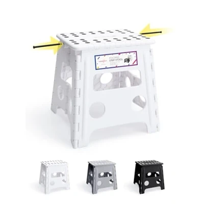 【Premium Quality & Non Slip】-Features a compact and sturdy seamless footrest,provide long-lasting strength and use.Improved product structure and Increase the folding seam position to prevent cracked ,making sure that the maximum load capacity of the folding step can be 300 pounds.Special rubber dots on the surface and anti-slip black rubber strap on each foot for maximum foot grip and gives amazing comfort, preventing slippage. 【Portable Folding Stool】-An extra light model is the Folding Step Stool Chair from Houseday. The clever puzzle-like design allows this particular compact stool to fold up into a low-profile package. Its wide base, non-slip feet and non-slip treads ensure it won't slip or slide when you stand on the stool. 【Space Saving Foldable Stool】-HOUSE DAY Stepping Stool save your closet space more than 90% when it folded up.It's quickly and easily folds away for convenient storage so you can opens with one flip of the hand.Also you can hides them in corner at home because it's so compact. 【Safe Upgrade Kids Stand Stool】-Features improved the folding bar,which can prevent from collapse inward while standing on it.HOUSE DAY have designed a safety stop gap feature that allows the foldable stool to prevent being squashed, great for kids & adults. Four round corner super safe protect your body from clashing. All of this design is put your kids safe first. 【Quality Gurantee】-Keep using quality materials to ensure the best quality. The lightweight plastic is hardy and not prone to rust or decay. It’s perfect for any gardener looking to hunker down with their plants or reach for that extra tall shelf in the garden shed. 【Safety Guidelines】-HOUSE DAY Folding Step Stool is EN 581 certified, we offer a wide range of height sizes (22/27/33/40/46cm) of step stools to choose from. If we need to stand on it to reach a high place, please make sure the stool is fully extended and on a smooth surface. Please note that children under the age of three should not use the stool.