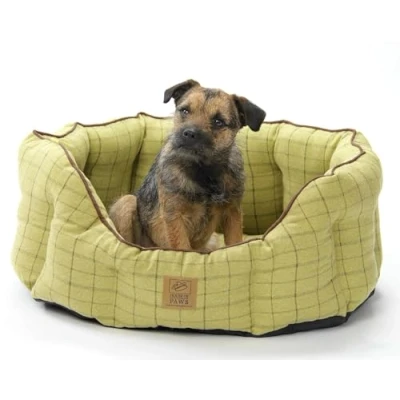 AmazonGreen tweed pet bed with brown suede piping. This beautiful tweed fabric is soft and cosy. The bed features a water resistant non slip base. SMALL 55cm L x 50cm W x 25cm H