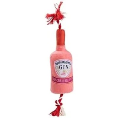 Fun plush dog toy shaped like a bottle of pink gin with a witty label design. Features a squeaker inside to keep your dog entertained and engaged. Includes a pink rope through the center for added playtime fun. Ideal for games of fetch or solo play, making it a versatile addition to your pet’s toy collection. Supervision advised during use; remove the toy if torn or ripped to ensure safety.