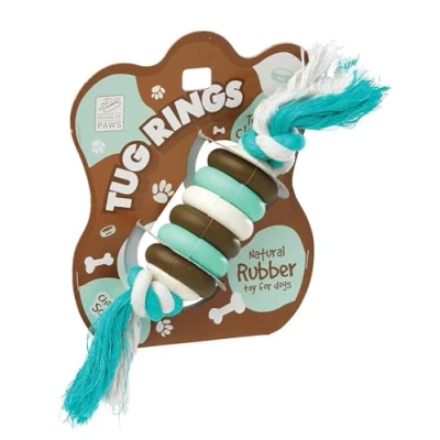 Durable Rubber & Rope Design: Sturdy materials withstand tugging, fetching, and chewing for lasting playtime. Multi-Ring Structure: Engages dogs with multiple rings, adding versatility for interactive or solo play. Ideal for Fetch & Tug: Perfect for games of fetch or tug of war, promoting active play and bonding. All Breed Compatibility: Perfect for dogs of all sizes and activity levels. Supervised Use: Always supervise play and remove the toy if it shows signs of damage.