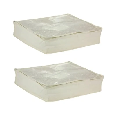 This canvas sweater bag is offered in a pack of 2 to provide you with a great option for secondary storage to decongest your closet and drawers. The soft-sided, breathable poly canvas allows air to circulate to keep items fresh and reduces the risk of snagging. Use as a compact and versatile storage option for sweaters, blankets and other linens. Clear-windowed top and zipper allow for quick access, without needing to open each bag. 3” H x 14.5” W x 12.25” D Fits comfortably on closet shelves or under the bed