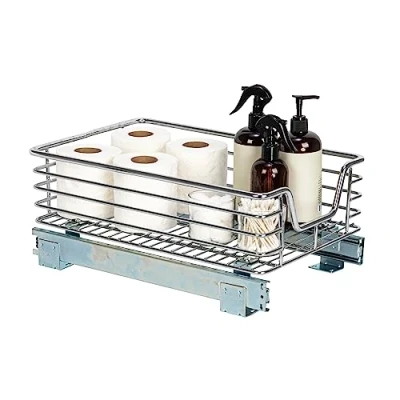 This cleverly designed, chrome-plated steel organizer offers ample storage space crafted to fit anything from cans and dry goods to cleaning essentials; Equipped with an easy-mount full-extension ball-bearing sliding base Compatible with most standard bathroom and kitchen cabinetry; Designed to mount directly onto hard surfaces Maximum weight capacity of 33 pounds Made from quality, chrome-plated steel; Arrives fully assembled and installation is simple (mounting hardware included) Organizer measures 17.75 inches D x 11.5 inches W x 7.25 inches H (See product images for detailed measurements)