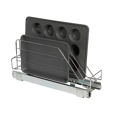 This cleverly designed, chrome-plated steel organizer offers 3 storage slots to fit multiple pieces of cookware and bakeware; Equipped with an easy-mount full-extension ball-bearing sliding base Compatible with most standard kitchen cabinetry; Designed to mount directly onto hard surfaces Maximum weight capacity of 8.8 pounds Made from high quality, chrome-plated steel; Installation is simple (mounting hardware included) Organizer measures 21 inches D x 5.25 inches W x 10 inches H (See product images for detailed measurements)