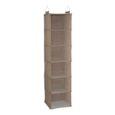 This hanging closet organizer will help you arrange any closet in your home with its 6 shelves and natural appeal. Made of breathable brown poly linen with PEVA shelving and a 2-hook hanging system to reduce bowing or bending of the shelves. Use this closet organizer to sort your bedroom, linen or bathroom closets for a more versatile space. Can be used on rod or wire closets. 50” H x 12” W x 12” D
