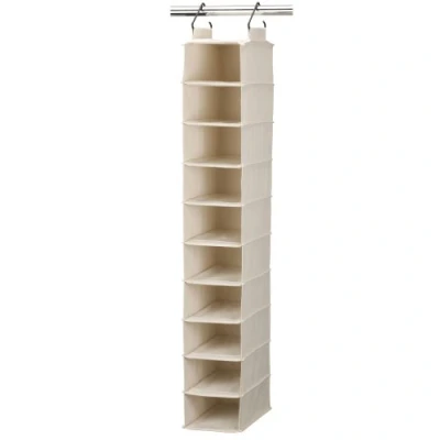 This canvas hanging shoe organizer offers a unique way of organizing footwear, with features for protecting against moth damage and stale odors. Hanging shoe organizer made of breathable and heavy-duty cotton canvas. Store 10 pairs of shoes without cluttering the walkway or taking-up space. Industrial hangers secure the organizer to any rod or wire closet, and cedarline pockets offer space to insert cedar planks for moth protection (cedar planks not included). 50" H x 8.5" W x 12" D Made of fine, smooth, breathable canvas that protects shoes and looks good