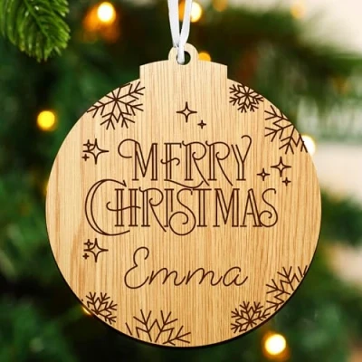Buy a fantastic Personalised Christmas Tree Decoration - a unique keepsake gift, perfect for Christmas. The decoration can be personalised with ANY NAME AND YEAR - we can add multiple names to the decoration. Our high-quality laser cut wooden Christmas decorations are made from 4 mm strong cherry wood. Size: Approx 9.5 x 9.5 cm Our laser cut machinery is top quality, giving you a precision finish on your engraving and cutting.
