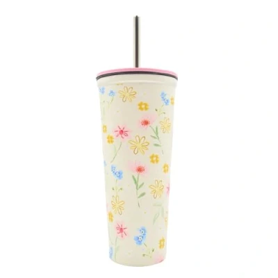 Hox 600ml Double Wall Stainless Steel Travel Soda Cup with Straw Mixed Florals Pink