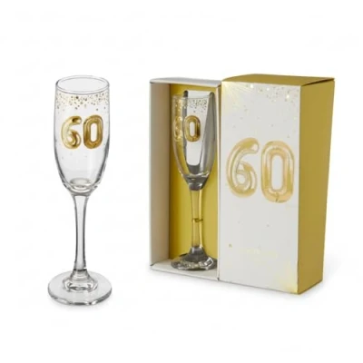 Celebrate a milestone in style with this beautifully crafted 60th birthday champagne flute, featuring a bold gold balloon‑style ‘60’ surrounded by shimmering confetti detailing for a festive, eye‑catching finish. Made from high‑quality, durable glass with a crystal‑clear look that enhances the sparkle of Champagne, Prosecco or sparkling wine, making every toast feel extra special on their big day. Presented in an elegant white and gold gift box with matching celebratory artwork, offering a hassle‑free present that feels premium and ready to give to friends, family or coworkers. A versatile keepsake that works beautifully for milestone birthdays, anniversaries or party décor, and can be displayed as a decorative reminder of a memorable 60th celebration. Comfortable to hold with a classic flute shape measuring approximately 6.7 x 22 cm; hand wash only is recommended to preserve the gold detailing and maintain the glass’s clarity.