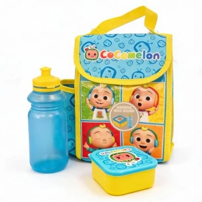 HOX Cocomelon 3 Piece Lunch Bag Set One Multi Compartment Bento Box, 1Ltr sipper water bottle with PEVA insulated Carry & Drinks Holder Ideal Gift for School Kids