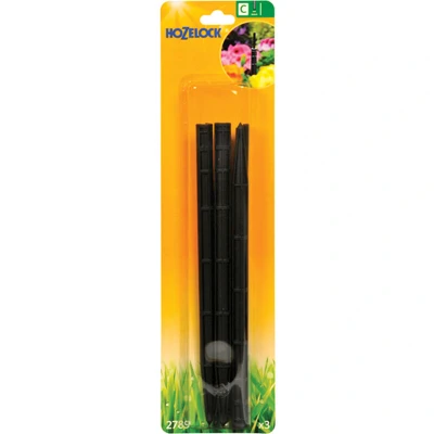 General description The Hozelock 2789 High Spike End Of Line Micro Irrigation is a pack of three high-quality support pins made from UV stable plastic. These spikes are designed to elevate the irrigation pattern above foliage by up to 35 cm, ensuring optimal water distribution. They can be used at the end of a 4mm hose or branched off from a 13mm supply tube, making them versatile for various irrigation setups. Technical specifications Number of pieces: 3 support pins Support pin height: 300 mm Extension length: 300 mm Overall height: 445 mm Width: 115 mm Depth: 40 mm Compatibility and accessories Designed to support capillary tubes used in microdiffusers Compatible with Hozelock drippers, mini sprinklers, and micro jets Installation Insert the support pins into the designated mounting points Attach the extension to increase the height of the microdiffusers as needed Ensure secure placement for stable operation Usage Use support pins to hold capillary tubes in position within your