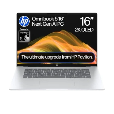 AI-DRIVEN PERFORMANCE AND UP TO 34 HOURS OF BATTERY LIFE: The HP OmniBook 5 16" AI PC is built for advanced performance and seamless portability, with an ultra-thin profile and HP AI Companion to act as your on-device personal assistant and streamline your workflow. Leave your charger behind with up to 34 hours of battery life and charge up to 50% in just 30 minutes with HP Fast Charge. UP TO 34 HOURS OF BATTERY LIFE: AI-driven performance and a battery life of up to 34 hours offers power and reliability anytime, anywhere. ADVANCED PERFORMANCE WITH AN ULTRA-THIN PROFILE: More speed and efficiency powered by Snapdragon X Series Processors and a dedicated AI engine. AN EXPANSIVE AUDIO-VISUAL EXPERIENCE: Enjoy rich colours on a 2K OLED display, powerful sound with HP Audio Boost, and a 1080p FHD IR camera. HP AI COMPANION: Your AI companion for instant answers and secure file analysis. Analyse sensitive files, query on the go, and seamlessly call on the intelligence of AI for all your everyday tasks. OLED DISPLAY: With display technology that lights each pixel separately, you'll get deeper blacks for richer contrast, enhanced colour depth, and more power efficiency than traditional LED screens. SNAPDRAGON X: Perfect for on-the-go productivity, this processor delivers essential performance, AI capabilities, and long-lasting battery life. Stay efficient and connected all day, every day. QUALCOMM ADRENO GPU: Experience high performance graphics and rich user experiences while optimizing power consumption. Elevate your mobile UI, games and advanced graphics applications with fast responsiveness and superior mobile connectivity. HP FAST CHARGE: When your laptop is low on power, no one has time to wait hours to recharge. Power down your device and go from 0 to 50% charge in approximately 30 minutes. TRY PC GAME PASS FOR FREE WITH YOUR NEW HP DEVICE: Play hundreds of high-quality PC games with your new HP device and 3 free months of PC Game Pass – including EA play. With new games added all the time, there’s always something new to play.