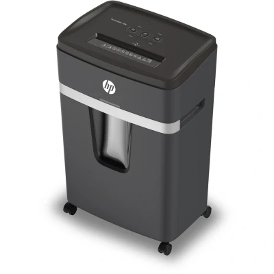 It's all about data protection. The HP Pro Shredder 12MC is an 12 sheet Micro Cut shredder that also accepts staples, paperclips and credit cards into a 220mm (A4) Entry Throat. It will shred paper into 2*15mm (P-5) pieces into a 25 litre bin.It features paper overload & bin full visual indicators on the top of the machine and also an overheat light when the 12MC has been continuously shredding for 30 minutes. This shredder also makes use of HP's anti jam technology and will auto reverse if too much paper is inserted and features castors for ease of movement.For added peace of mine the HP Pro Shredder 12MC also comes with a full 2 year manufacturer's warranty. Sheet Capacity = 12 Sheets per Pass. Sheet Size = 2x15mm. Shred Type = Micro Cut. Din Level P-5. Throat Width = 220mm. Bin Capacity = 25 litres. Motor = 400 watts. Shred Speed = 1.6mm per minute. Operating Noise Level = 55dB. Width = 387. Depth = 260. Height = 580. Height = 580. Machine Warranty = 2 years
